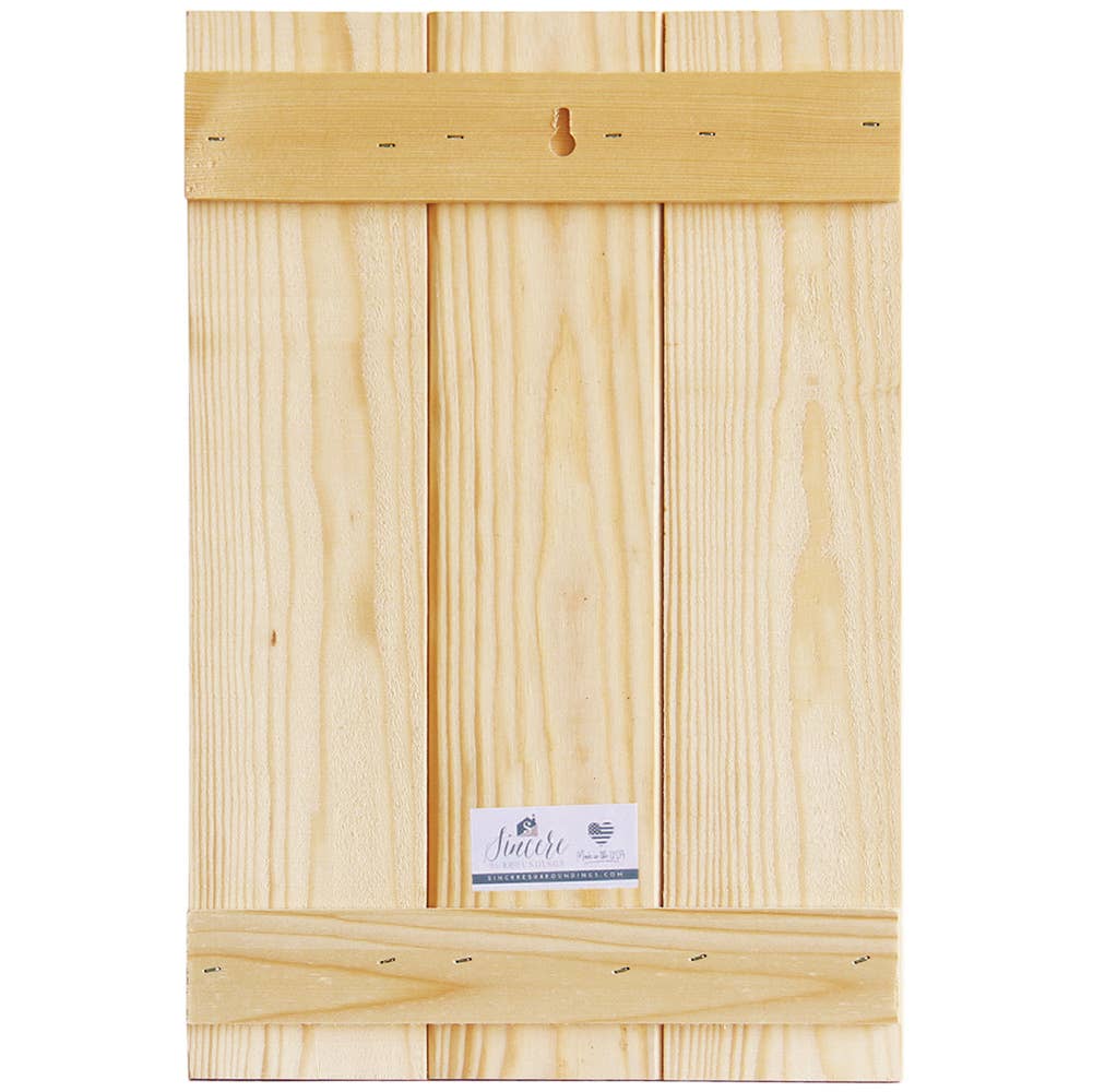 Natural pine wood material adds rustic charm to any decor. • Easy to hang by the keyhole in back, or display in your favorite easel or shelf. • Weathered, distressed design creates a piece that is simple yet refined. • This distressed wood pallet is handmade; no two pallets will look alike. • Proudly designed, printed and handcrafted in our small town shop in Rock Rapids, IA — USA.