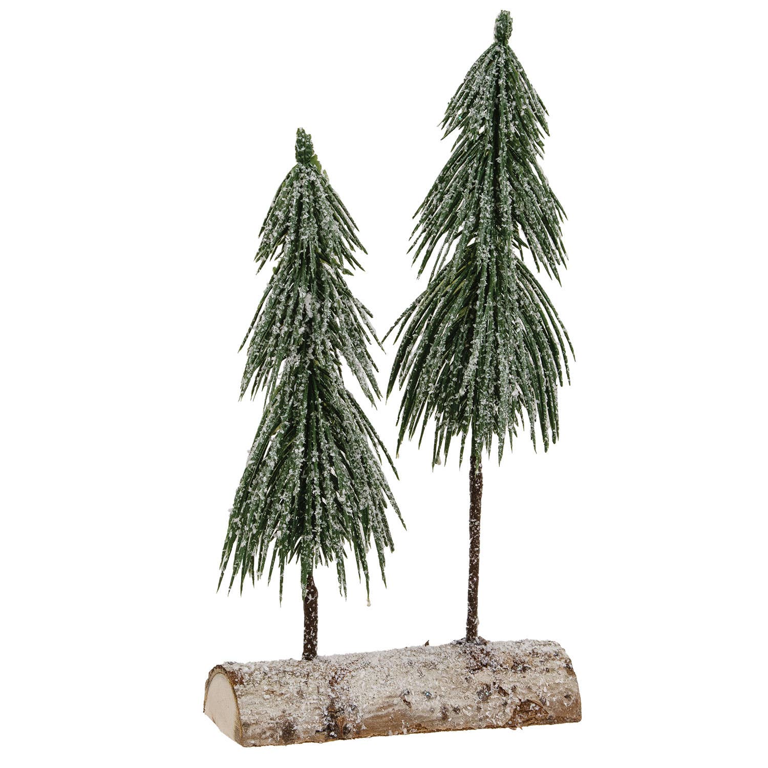 Bring Winter charm to the classic country farmhouse with our Snowy Pine Tree Pair on Log. This pair measures 12" high by 6" wide and has a depth of 2.5." These trees feature plastic green branches and have a dusting of flocked snow from top to base for a wintry finish. It has a sturdy, half-log, natural-looking base that would look great perched on a side table, paired with a reindeer sitter, or as part of a larger winter display.