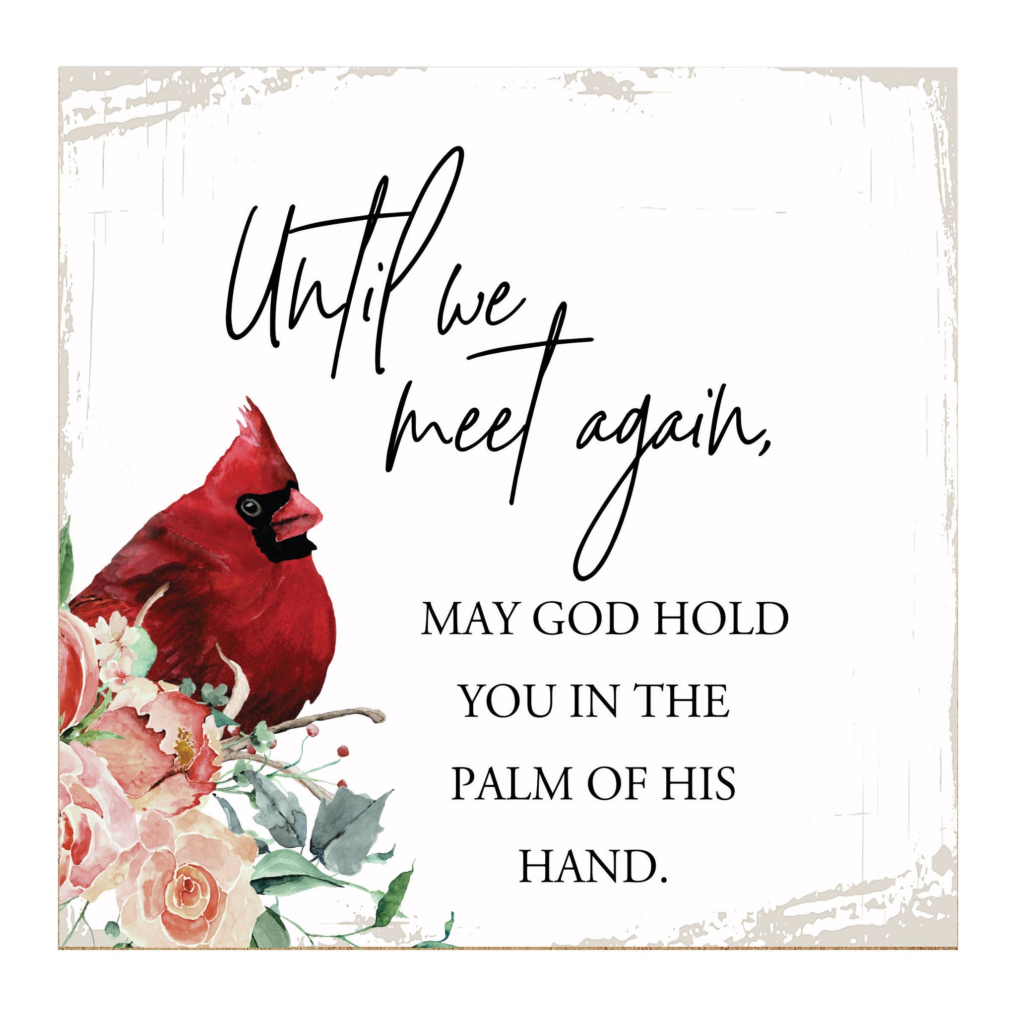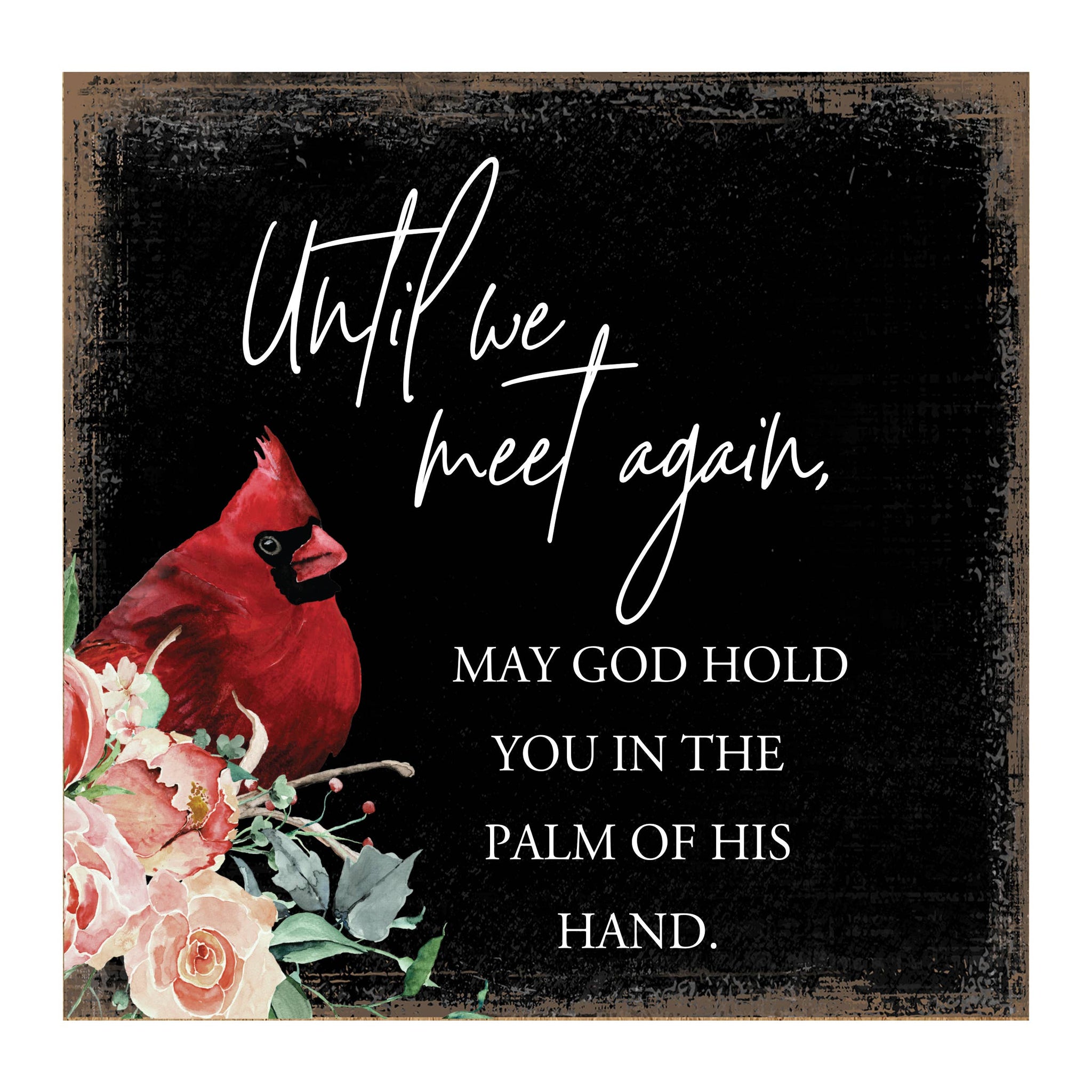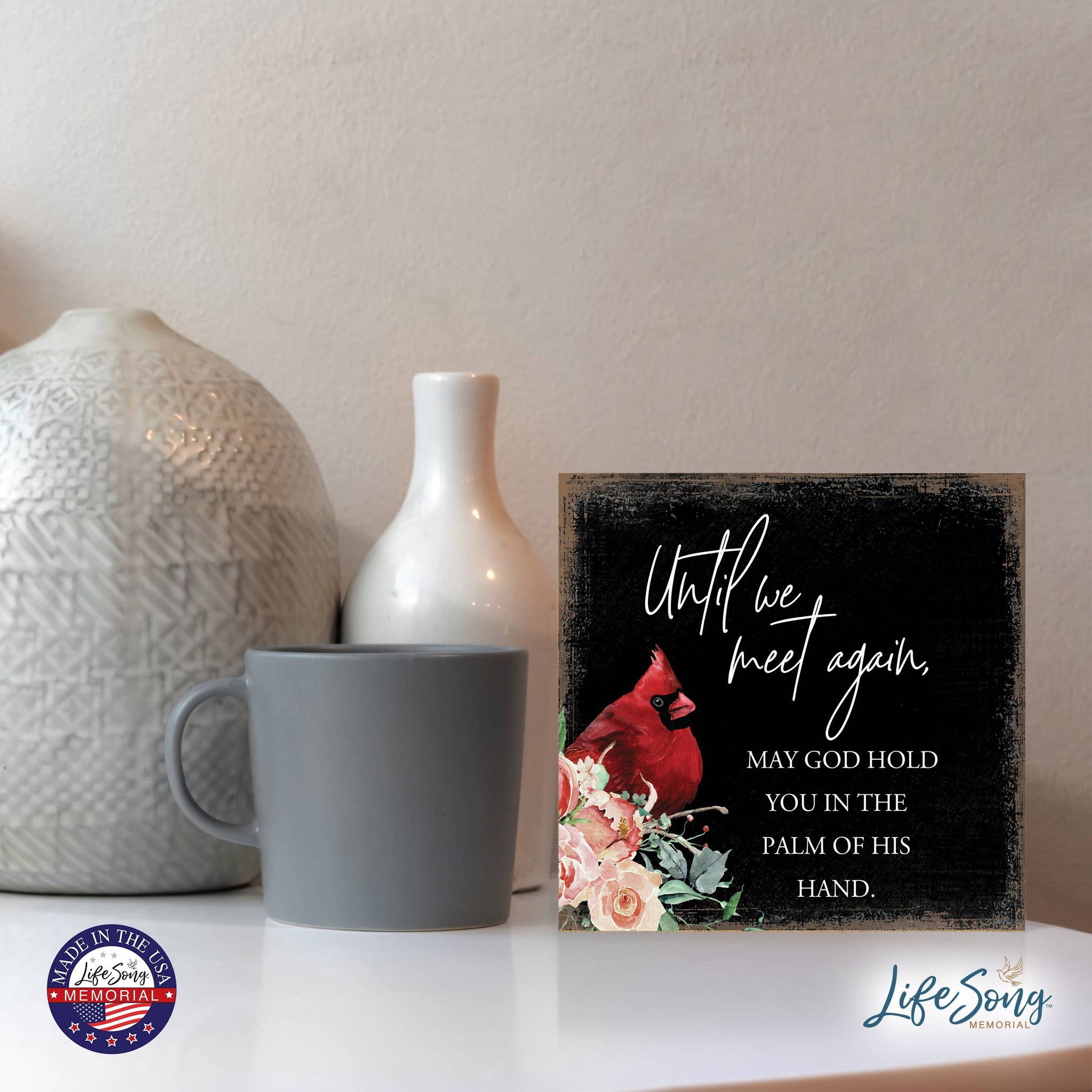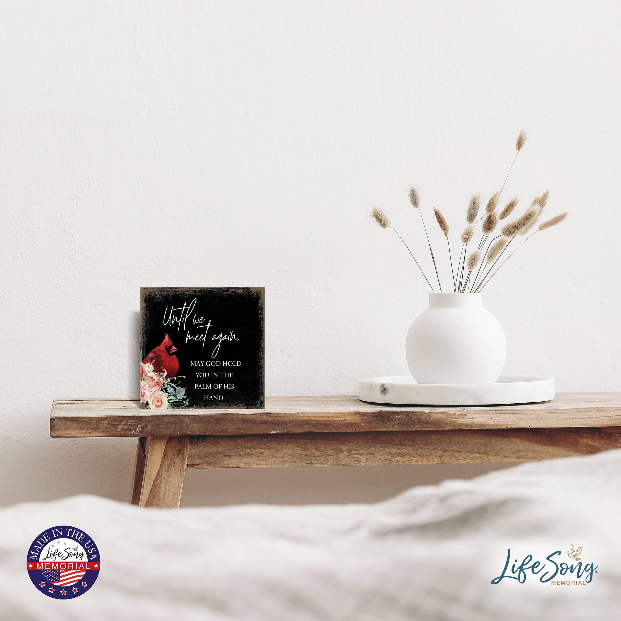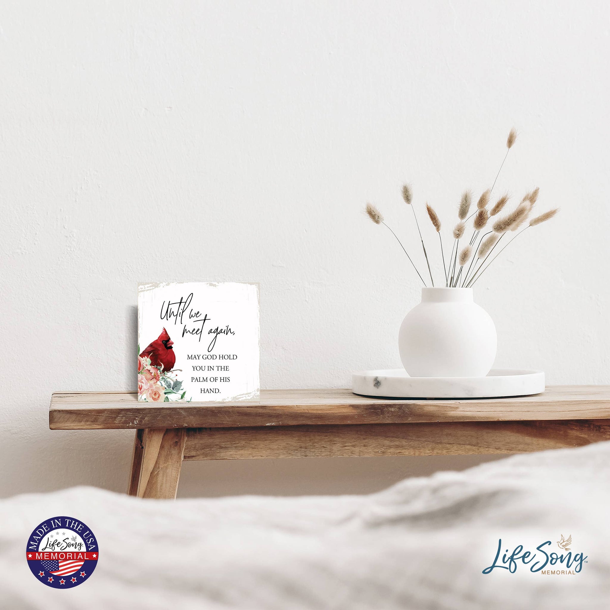Honor the memory of a loved one with our "Until We Meet Again" Shelf Sitter, a heartfelt bereavement gift. Made in the USA, this distressed tabletop piece serves as a touching condolence gift. The handcrafted design features a cardinal sign, symbolizing hope and remembrance. Ideal for displaying on a shelf or table, this memorial shelf sitter brings comfort and solace to any setting. The timeless verse "Until We Meet Again" is elegantly displayed, making it a meaningful addition to your home or a thoughtful gift for someone going through a difficult time.