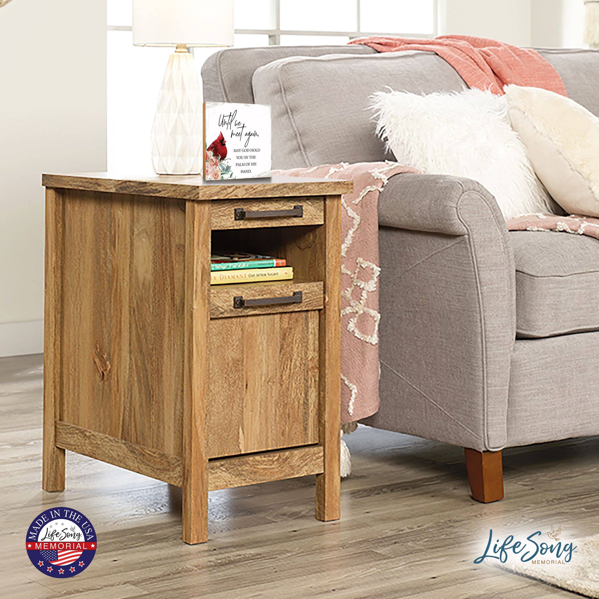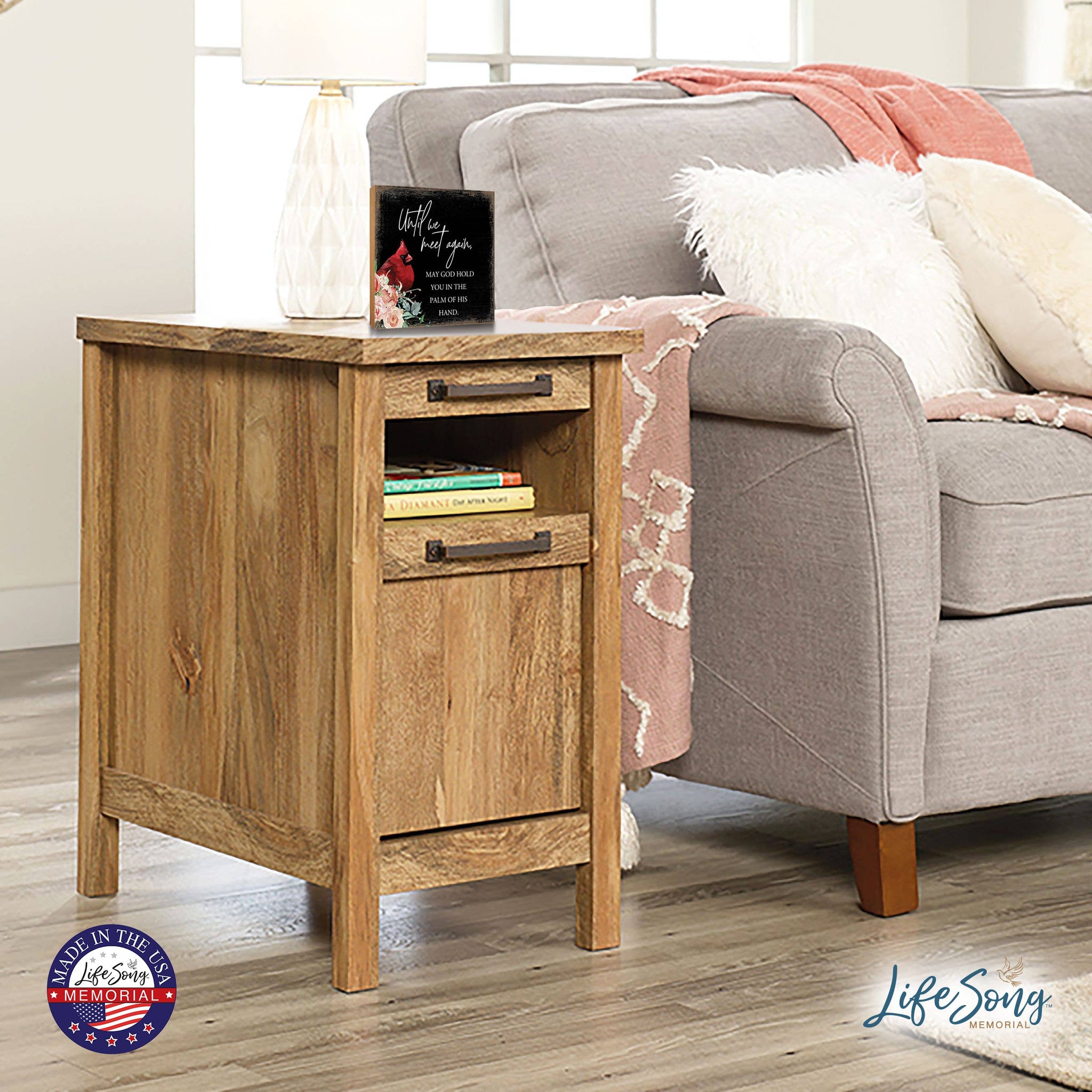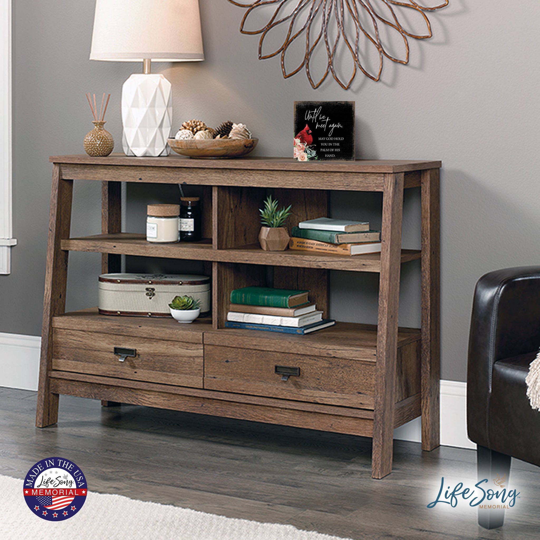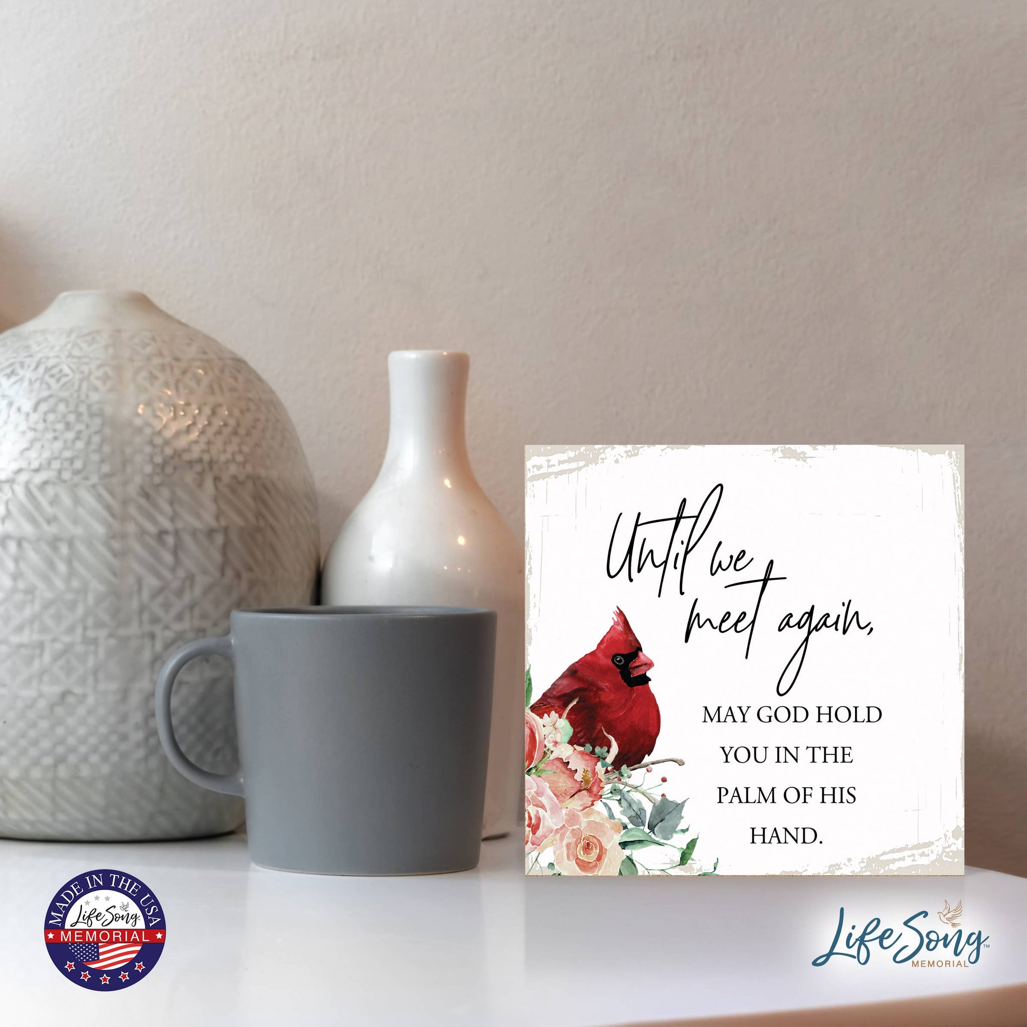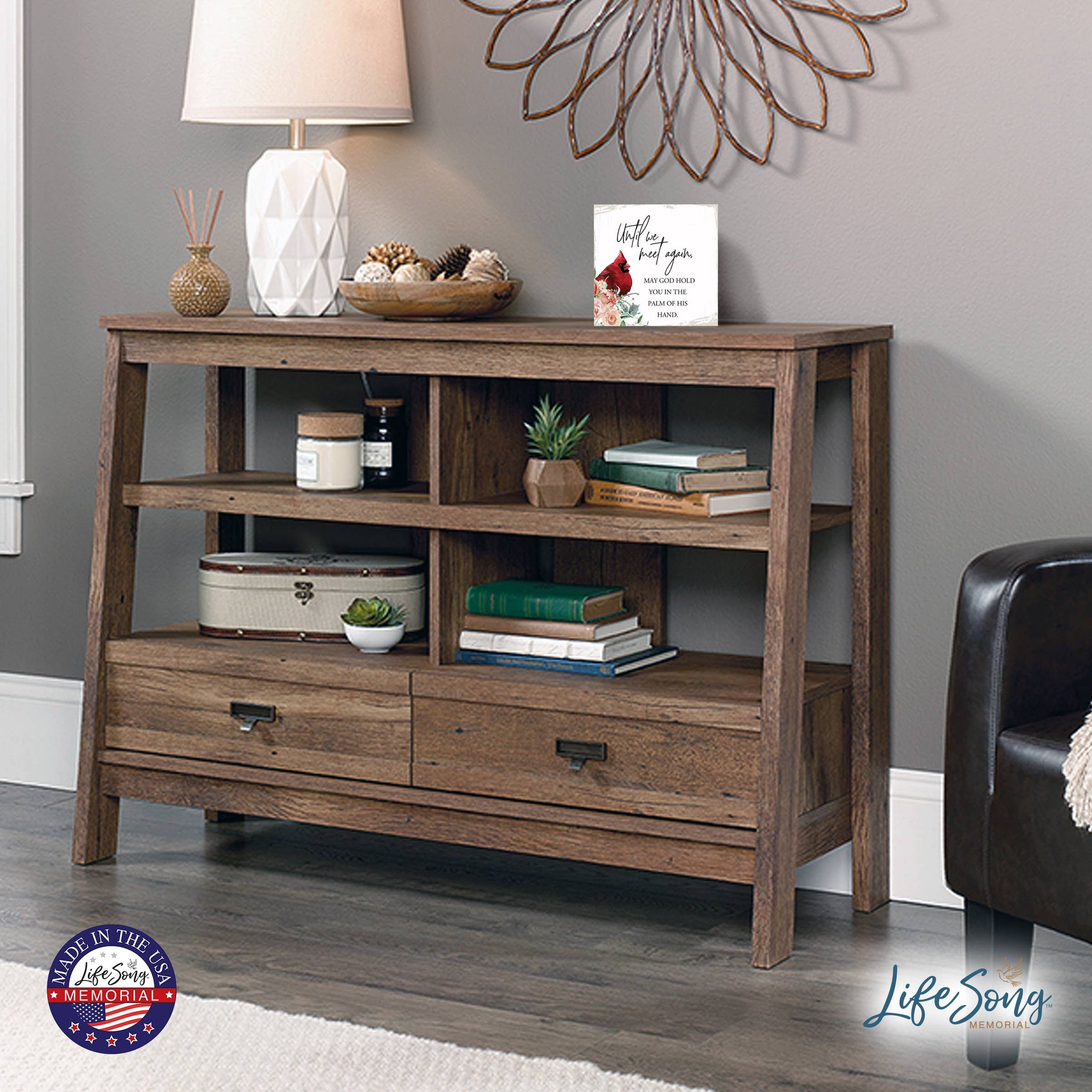 Honor the memory of a loved one with our "Until We Meet Again" Shelf Sitter, a heartfelt bereavement gift. Made in the USA, this distressed tabletop piece serves as a touching condolence gift. The handcrafted design features a cardinal sign, symbolizing hope and remembrance. Ideal for displaying on a shelf or table, this memorial shelf sitter brings comfort and solace to any setting. The timeless verse "Until We Meet Again" is elegantly displayed, making it a meaningful addition to your home or a thoughtful gift for someone going through a difficult time.