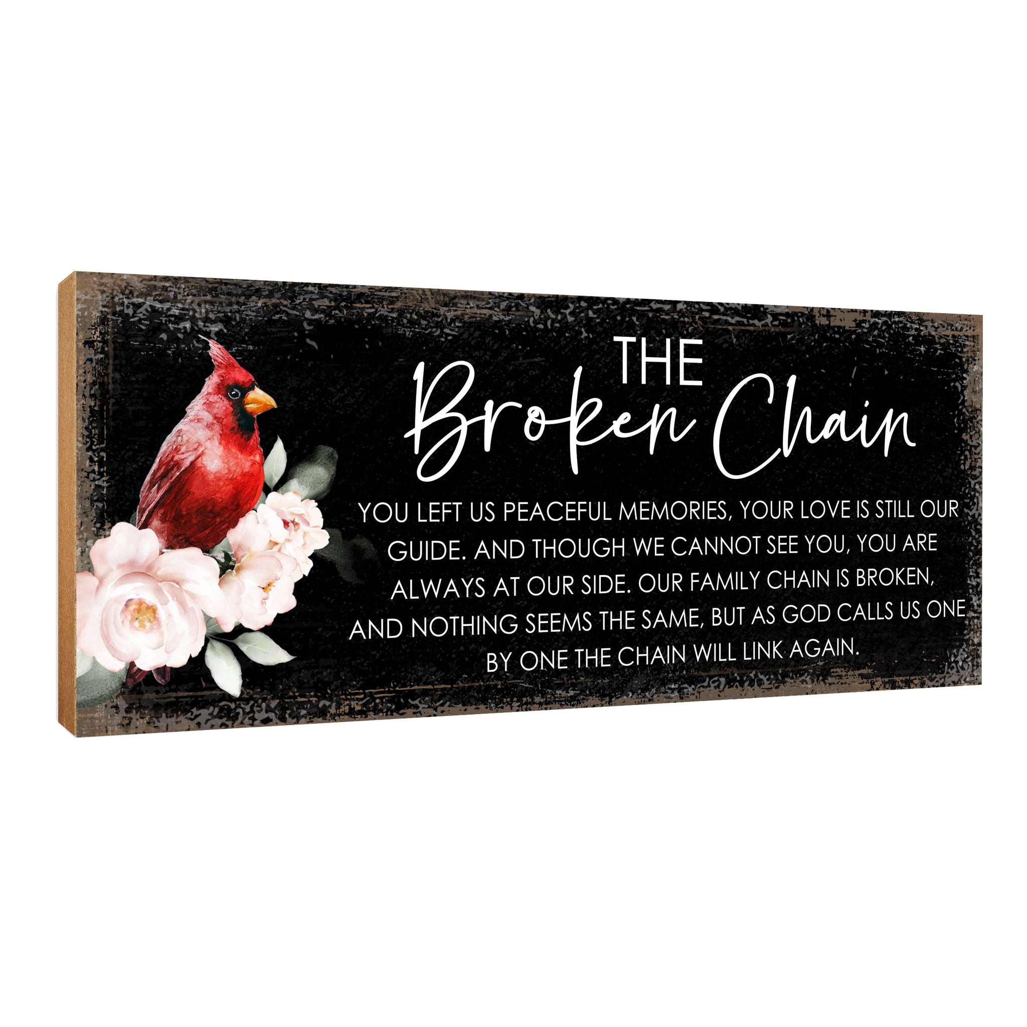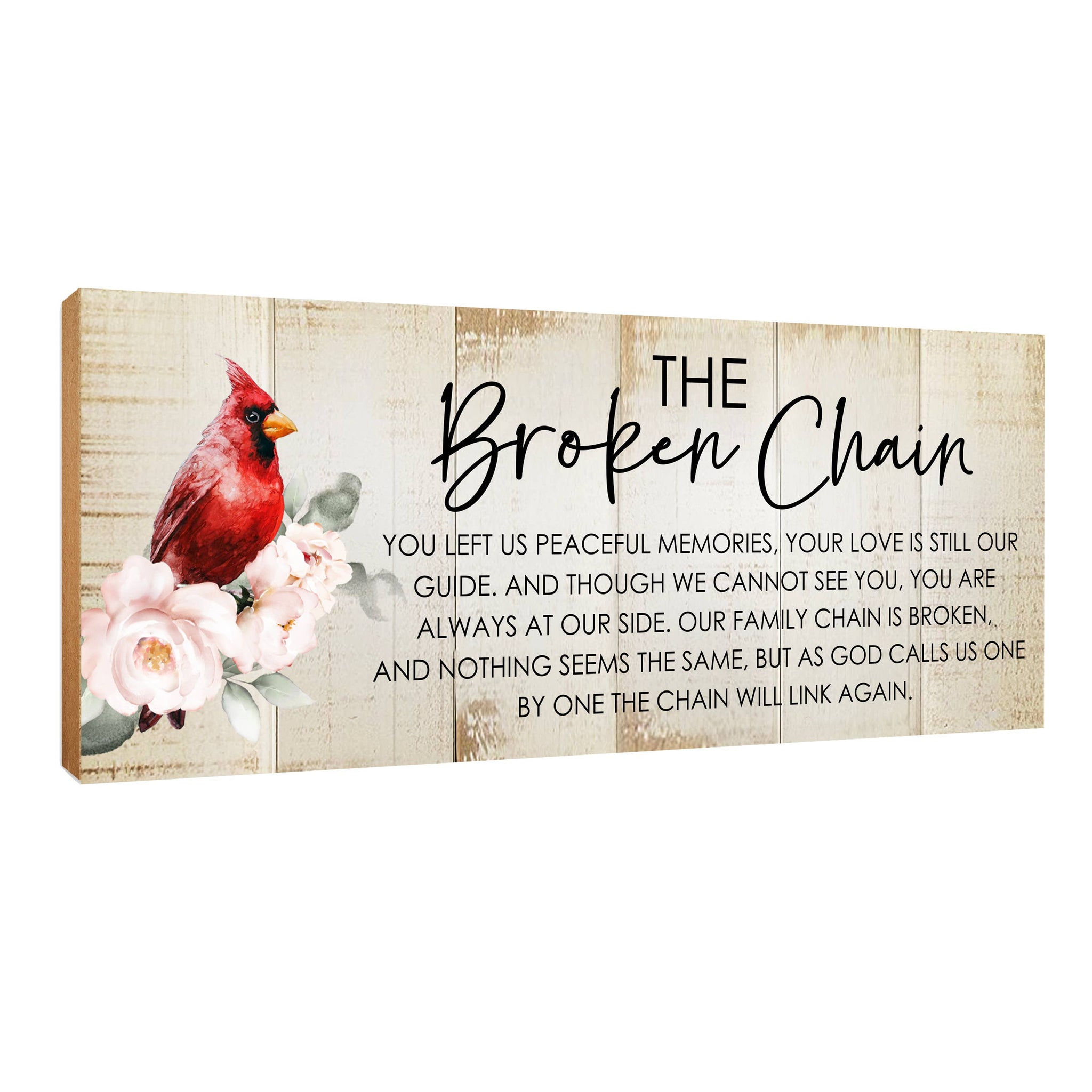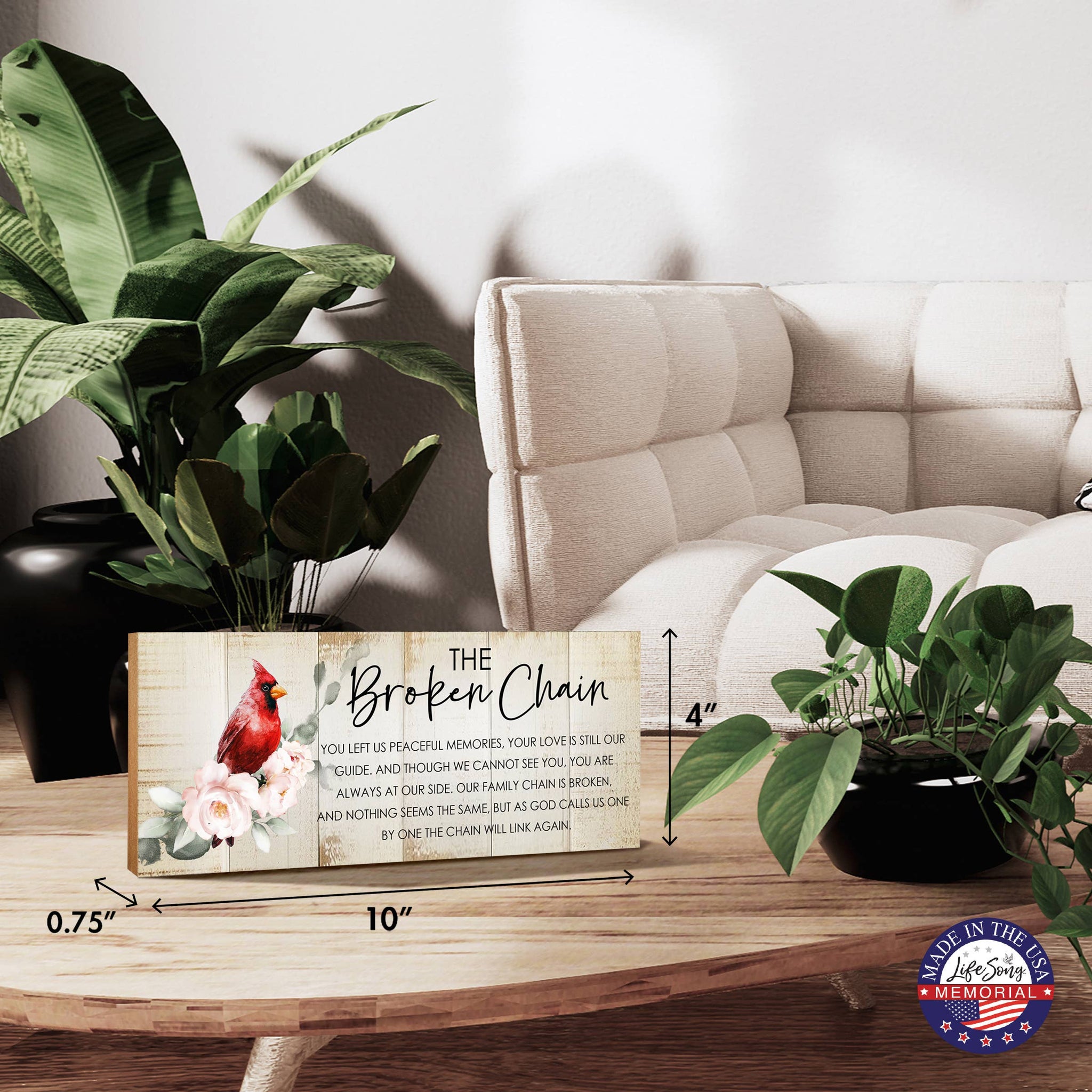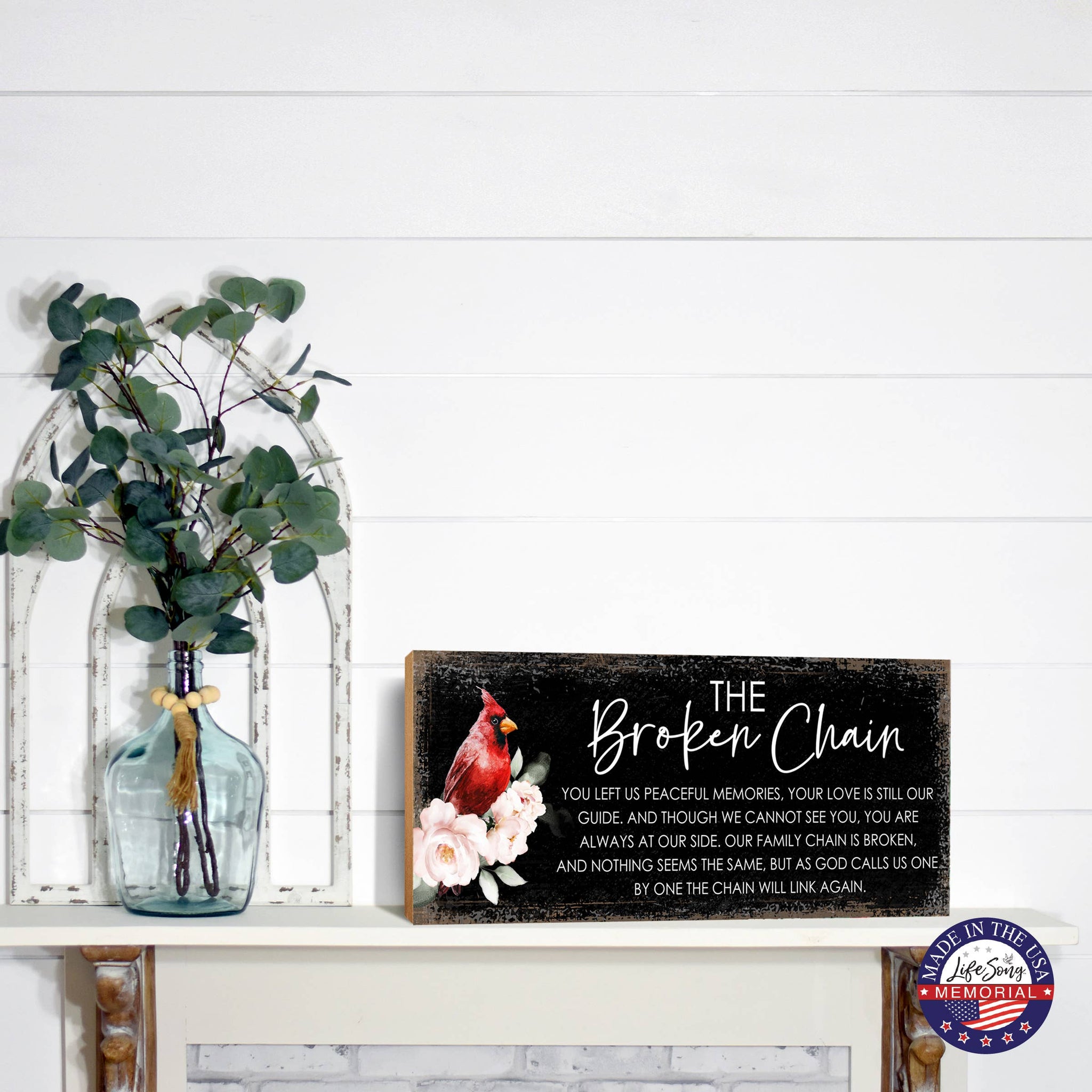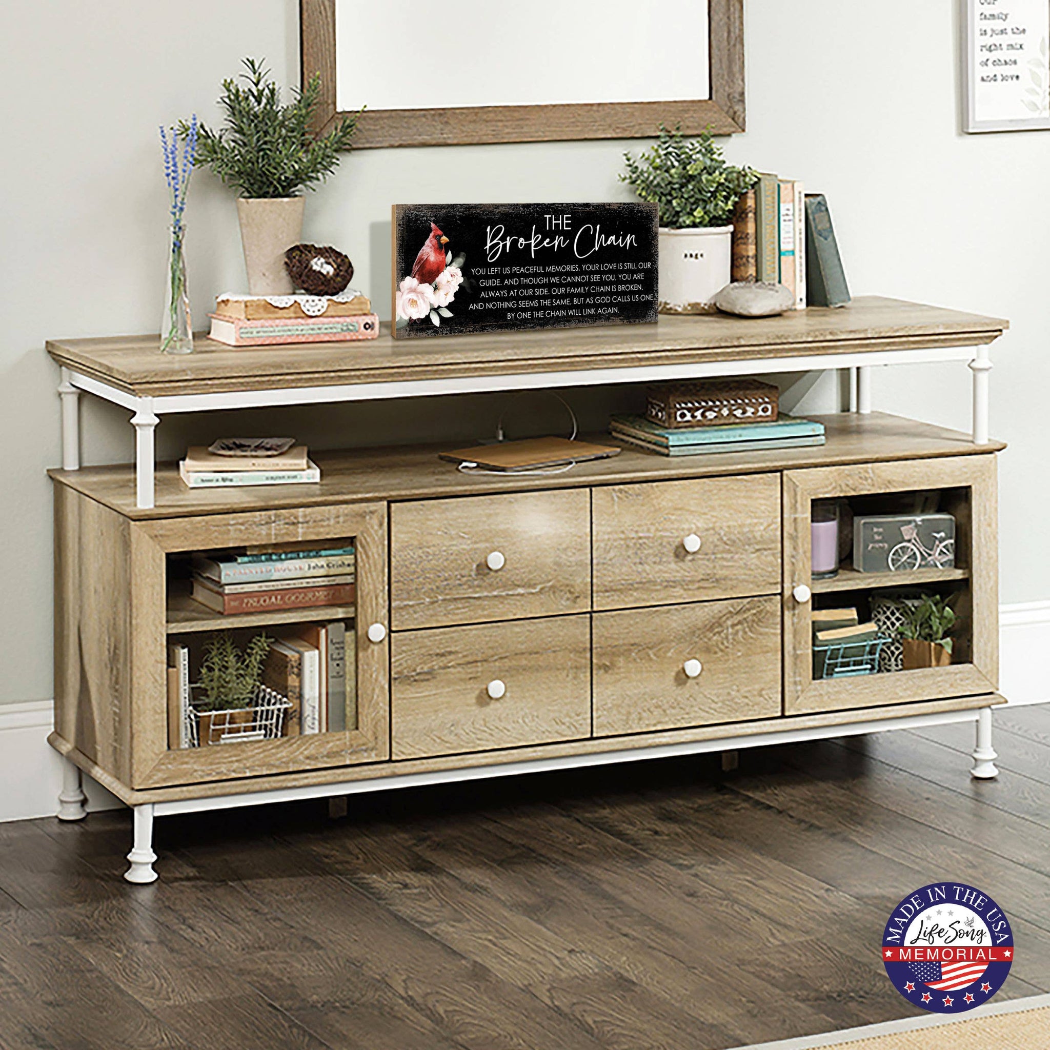 Handcrafted with care in the USA, our "Sympathy Cardinal: The Broken Chain Shelf Sitter" serves as a touching memorial tribute. This beautifully crafted piece, made from durable MDF, honors the essence of remembrance and love. The iconic cardinal, a symbol of hope and love, accompanies the heartfelt verse "The Broken Chain," bringing feelings of peace during times of bereavement. Perfectly designed for shelf display, this thoughtful keepsake offers a heartfelt condolence to cherish and honor the memories of loved ones. Embrace the essence of "In Loving Memory" with this touching shelf sitter, designed to bring comfort and remembrance during moments of sympathy.